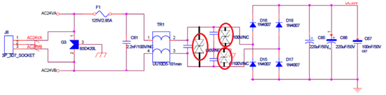 更改電路,由于原PCB空間限制,實際電路選用了檳城BV-SMBJ58C2H,SMB封裝,功率達到3000W,相當于BV-SMDJ58CA。測試雷擊AC24V電源口AC24VA測試通過,AC24VB測試后設備損壞,詳細檢查電路后發(fā)現(xiàn)整流橋二極管燒毀。