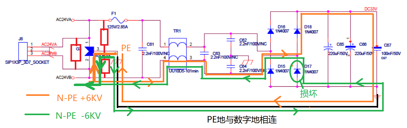 如上圖黃色所示為N-PE +6KV測試時的能量流經圖,大能量從AV24VB開始大部分通過TVS管泄放到地,另一部分能量通過后極整流橋D18通過DC33V與地的電容流經,由于電容隔離在,因此后極泄放的能量很小,不至于把整流橋搞壞。測試結果為通過。