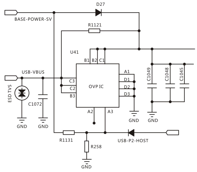 產品電路圖如下(原電路圖),該USB接口輸入端有三級防護,初級是一個ESD類的防護器件,后級還有一個OVP防護器件,兩級之間沒有做退耦器件。查相關規格書,OVP的通流較小,為5A。前級ESD通流相對較大點,為100W,折算成8/20μs的電流,約為13A左右。