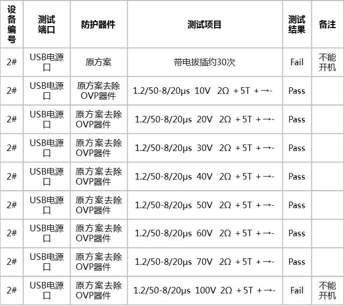 某客戶的智能手持式POS機,使用的是USB口作為整機的電源輸入口,在使用過程中,經過數次帶電拔插,設備就不能開機了,電源輸入異常。拆機,測量USB電源兩端為短路,查出為OVP芯片短路所致。由于去除了OVP器件,客戶擔心實際使用過程中會存在應用風險。故,提出EOS滿足200V的測試要求。