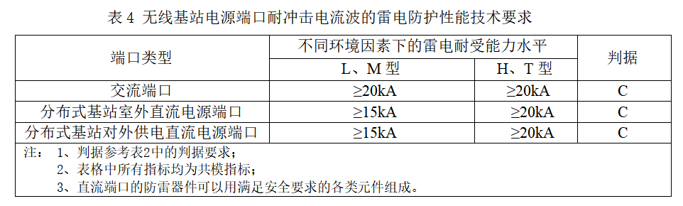 以下是《YD/T 2324—2011 無線基站防雷的技術(shù)要求和測試方法》,對電源端口的雷擊防護(hù)要求: