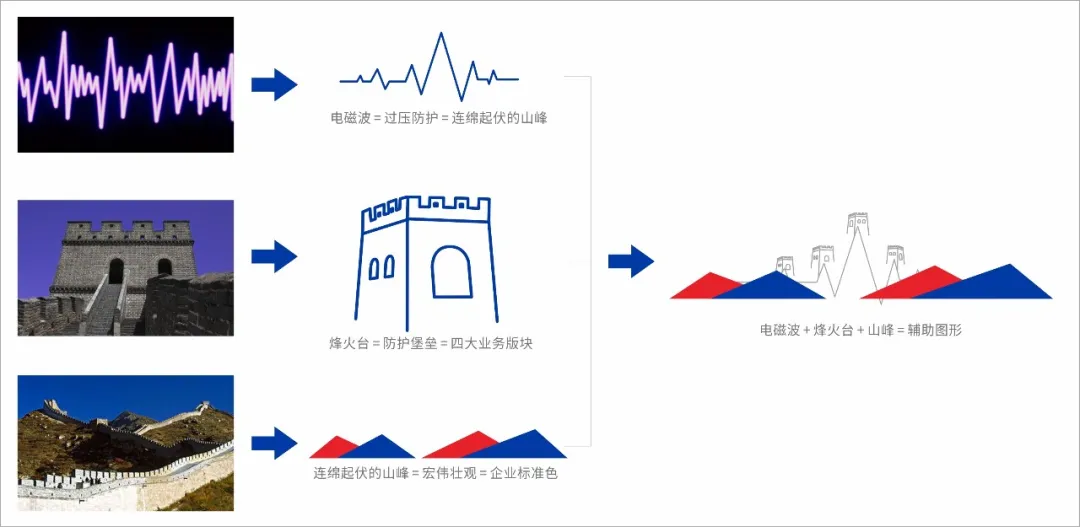 輔助圖形以長城為主元素+電磁波形+山峰組合而成,形成一套完善的防御系統,堅不可摧的長城完美詮釋檳城電子的過壓防護理念和愿景,為檳城電子的產品代言。