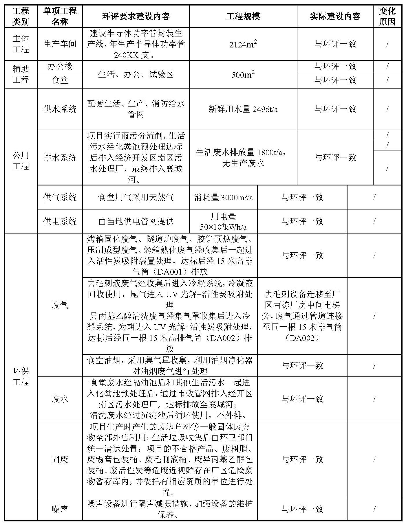 本項目營運期封裝生產(chǎn)半導(dǎo)體功率管過程中,其烤箱固化廢氣、隧道爐廢氣、膠餅預(yù)熱廢氣、壓制成型廢氣、烤箱熟化廢氣,主要污染物為VOCs。廠區(qū)內(nèi)設(shè)置了一套活性炭吸附裝置進行處理,處理后經(jīng)15米高排氣筒(DA001)達標(biāo)排放。去毛刺液廢氣、異丙基乙醇清洗廢氣主要污染物為VOCs,各自采用冷凝+UV光解+活性炭吸附裝置處理后,處理后經(jīng)一根15m排氣筒(DA002)達標(biāo)排放。食堂油煙先由集氣罩收集,后利用油煙凈化器對油煙進行處理后排放。